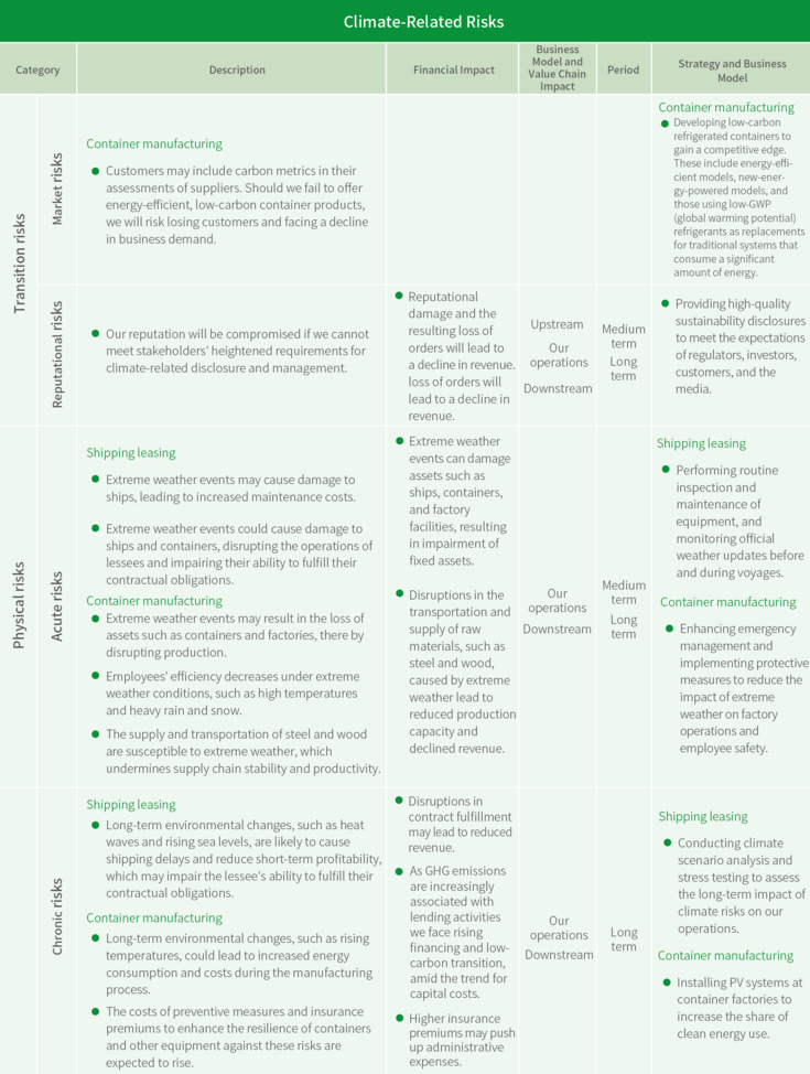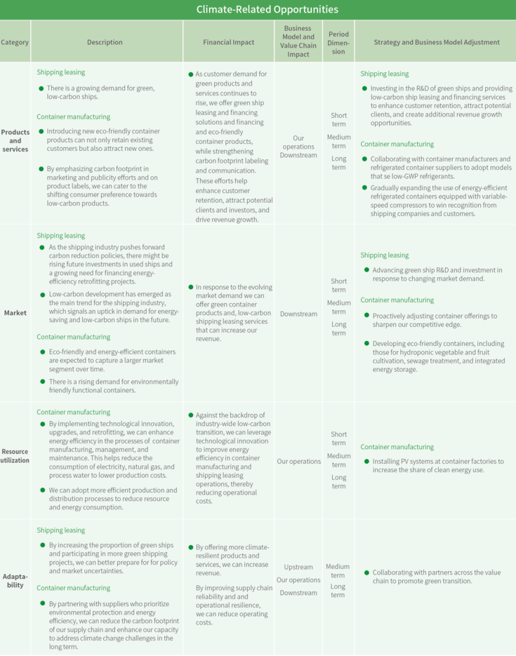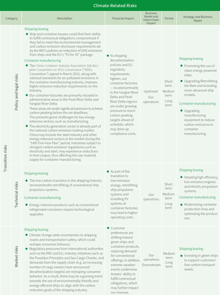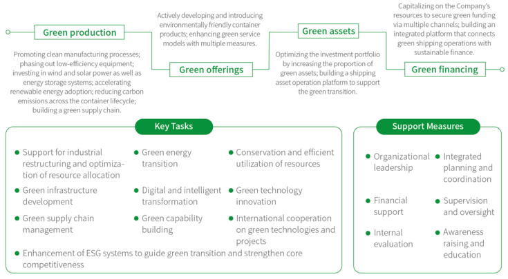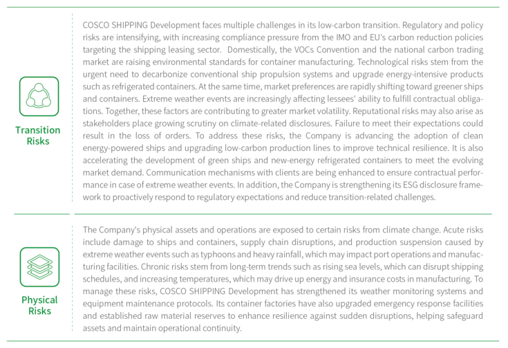 ● Governance COSCO SHIPPING Development recognizes climate change response as a key material topic for its sustainability management. The Company has established a Carbon Peaking Steering Group and corresponding working groups to guide, coordinate, and advance its carbon peaking efforts. Cross-functional coordination is carried out among various departments and subsidiaries, including the Department of Strategic Development, the Department of Industrial Investment, Shanghai Universal, and the Division of Shipping Leasing. Shanghai Universal has implemented the Regulations on Energy Conservation and Emissions Reduction Management, under which emissions reduction responsibilities are integrated as binding criteria into the performance evaluations of department heads. Based on the Company's overall annual energy conservation and emissions reduction (ECER) targets, specific indicators are allocated to individual departments and incorporated into their respective responsibility statements. Performance is evaluated in accordance with the Energy Conservation and Emissions Reduction Performance Scoring Sheet. If a major environmental incident results in significant social impact, or a serious violation of ECER requirements leads to adverse consequences, all performance-based bonuses may be forfeited. ● Strategy COSCO SHIPPING Development keeps track of domestic and international regulatory trends, adapts to evolving environmental standards in the container manufacturing and leasing industry, and stays responsive to emerging customer needs. With deep insights into the unique characteristics of each business segment, the Company focuses on five strategic priorities: material innovation and efficient use, energy decarbonization and system efficiency optimization, technological innovation and process improvement, resource conservation and recycling, and reduction of product carbon footprint. In 2023, the Company introduced a comprehensive roadmap for its low-carbon transition. The roadmap outlines four strategic pillars and eight implementation pathways, with clearly defined tasks for each business segment. Each segment thereby develops actionable plans, setting measurable targets, and ensuring clear lines of individual accountability. For the container manufacturing segment, the long-term goal is to achieve carbon neutrality by 2050.